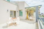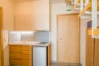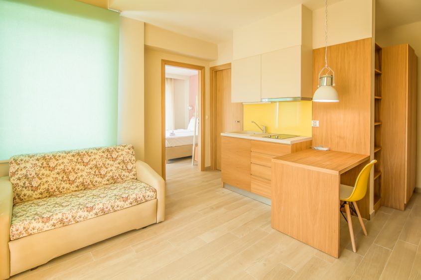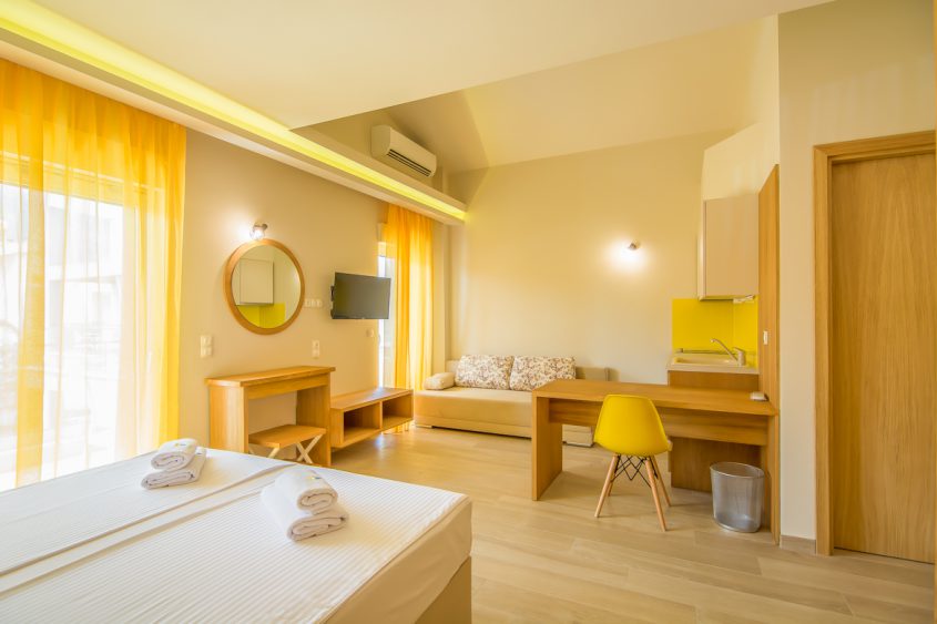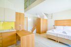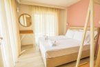 Grand Maisonette is a spacious room splitted into two levels. Downstairs, there is a king size bed, a sofa bed, kitchenette, a bathroom and a terrace. Upstairs there are two single beds designed for children. In total Vereya Beach offers maisonettes with views to the sea and to the mountain.
